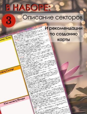 В Набор Карта желаний входит: Карта А3, состоящая из 9 секторов размещенных согласно древней науко о гармонизации пространства-Васту и подробной инструкции для каждого сектора; 296 правильно подобранных картинок-наклеек (наклейки на карту размером 2,2*2,8см) , 2 лунных карманных календарика на 2025 - 2028 год с благоприятными датами для создания карты желаний, подробная инструкция по составлению.